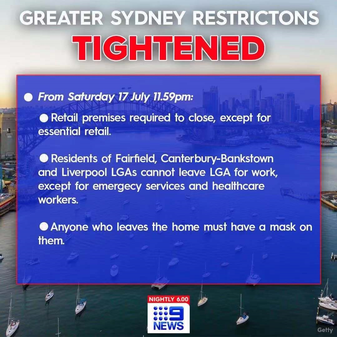 通知:因疫情原因,悉尼從當(dāng)?shù)貢r(shí)間7月17日星期六11:59開(kāi)始,實(shí)施出行限制,屆時(shí)在悉尼轉(zhuǎn)運(yùn)的貨物會(huì)有些延誤,我司會(huì)持續(xù)關(guān)注并更新貨物狀態(tài),請(qǐng)知悉并理解,謝謝!